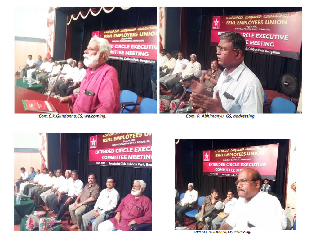 The Extended Circle Working Committee meeting of Karnataka Circle has been conducted on 9th July 2017, at Secretariat Club, Cubbon Park, Bengaluru. The main agenda for discussion was the recent developments with regard to 3rd PRC to BSNL Staff and the programme of actions related to it. Com. P.Abhimanyu, Gen.Sec., CHQ was the main speaker, who addressed the house at length. Circle Secretaries of the constituent unions and associations of BSNL in Karnataka Circle, viz., SNEA (I), AIGETOA, BASE (I) BSNL MS , SNATTA and AIBDPA were also present on dias. 497 delegates comprising of Dist.Secretaries,Dist.Presidents,Dist.Treasurers,CEC members,Branch Secretaries and ordinary rank and file members from all the districts of Karnataka Circle attended the meeting. Com. M C Balakrishna Circle President presided over the meeting. Com. Gundanna C K Cir.Sec., welcomed all the leaders, fraternal delegates and the delegates of the BSNLEU and gave key note address. Com. S B Nagavi, Circle Secretary, SNEA (I) addressed the house, on behalf of all the fraternal delegates who were on dias. Com. Sudharshan H V, DS BgTD and CHQ Org.Secretary gave vote of thanks. The house in one voice, resolved to see that the 3rd PRC which is due to BSNL, will be taken with consistent struggles and strikes. Photos have been attached pl.