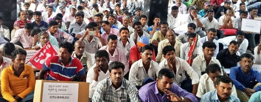 The BSNL Non Permanent Workers of Karnataka Circle marched to CGM Office on 15th March 2018. More than 1000 Contract workers sat on Dharana from 1100 hours to 1700 hours demanding payment of wages regulalry before 7th of every month; payment of minimum wages at all places; and many more demands. The programme of was inaugurated by Com.V A N Namboodiri President BSNL C&CWF CHQ; Com.Animesh Mitra Sec.Gen BSNL C&CWF addressed the workers; A detailed report is available inside;